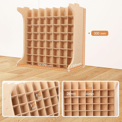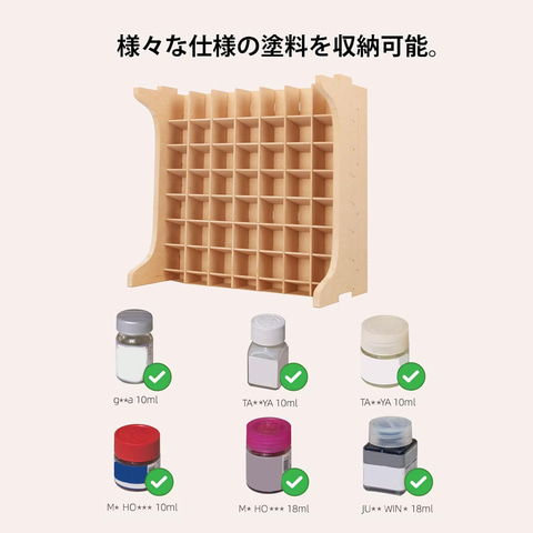 30×30cm(長さ×高さ)サイズのペイントラック。全7段で各段7本、計49本収納可能となっている。各格子が36×38mmなので、直径36mm未満のボトルを収納できる。