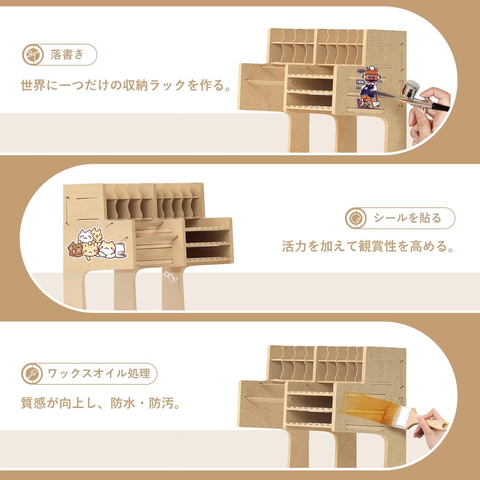 ニッパー、ヤスリ、カッター、ピンセット、鉛筆、塗料など、さまざまな工具を収納できるラック。省スペース設計で、作業スペースを広く確保できる。