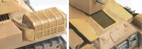 インジェクションパーツでは再現の難しい、細部に至るまで表現できるエッチングパーツを収録。エッチングパーツには、エンジングリルカバー、マフラー消音器メッシュ(2種)、マフラー後部、排気管基部、ハッチの取手、蝶番などが用意されている。
