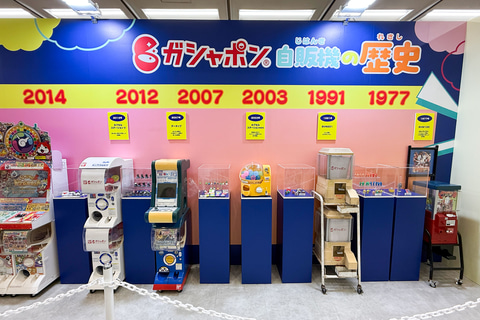 アイテム以外にも様々な展示が行われていたのだが、その中のひとつが「ガシャポン情報局」である。中でも注目なのが、ガシャポン自販機の歴史のエリアである。こちらでは、1977年に登場した初代ガシャポンのマシンから最新の機種まで、実物がずらりと展示されている。中にはかなり歴史を感じさせる見た目のものもあったが、これらを眺めているだけでも様々な思い出が蘇ってきそうだ。