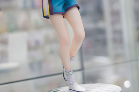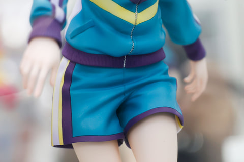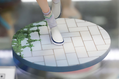 ウェアの下半身は半ズボンになっており、そこからは白くて細い足が伸びている。足元は、学生らしいソックスに白いシューズというスタイルだ。台座はオリジナルのイラストにも描かれていた川沿いのタイルを模したようなデザインになっており、こちらも今回の作品にピッタリ合っている。