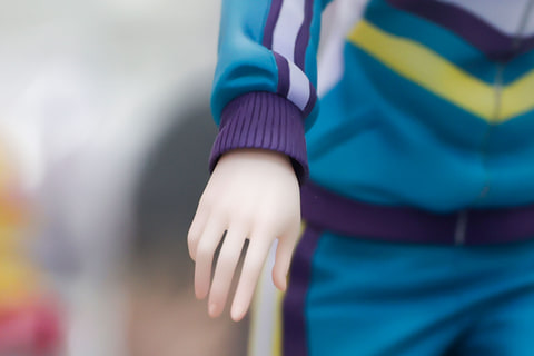 篠澤広が身につけている衣装は、カラフルなトレーニングウェアだ。どちらかというとセクシーなダイナマイトボディというよりもスレンダーな体型で、そのほっそりとした体のラインもよくわかる。このトレーニングウェアも、襟やファスナーの部分など、丁寧に作り込まれている。